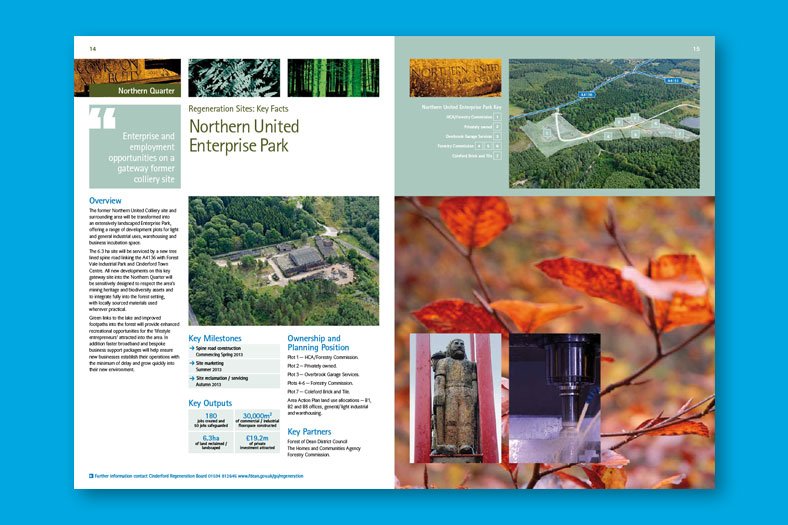 The new Forest of Dean – Cinderford Investment Prospectus brings new prospects for business growth, educational opportunities and economic development. The contemporary design and print reflect our enthusiasm for, knowledge of and expertise in the promotion of regeneration projects.